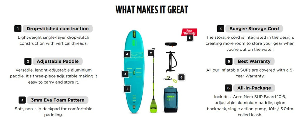 - Package contains: Aero Nera SUP Board 10.6, adjustable aluminium paddle, nylon backpack, single action pump,, 10ft / 3.04m coiled leash